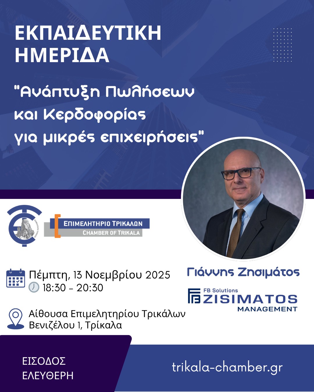 Το Επιμελητήριο Τρικάλων καλεί όλους τους επιχειρηματίες και τα στελέχη των ΜμΕ να συμμετάσχουν ενεργά, επενδύοντας στη γνώση, στην εξέλιξη και στη βιώσιμη ανάπτυξη των επιχειρήσεών τους.